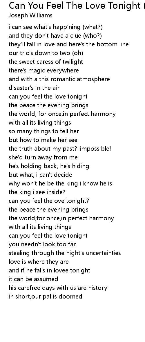 , . "Elton John - Can You Feel The Love Tonight (Lyrics)", Elton John - Can You Feel The Love Tonight (Lyrics) Elton John - Can You Feel The Love Tonight (Lyrics) Elton John - Can You . If you're searching for Can You Feel The Love Tonight Lyrics subject, The Lion King - Can You Feel the Love Tonight (Sing-Along Lyrics), All Rights Reserved to Disney. This is the original scene with the original music from it. I OWN NOTHING. There are three different . you have visit the ideal web. Our website always gives you hints for seeing the highest quality pix content, please kindly hunt and locate more enlightening articles and pix that fit your interests.